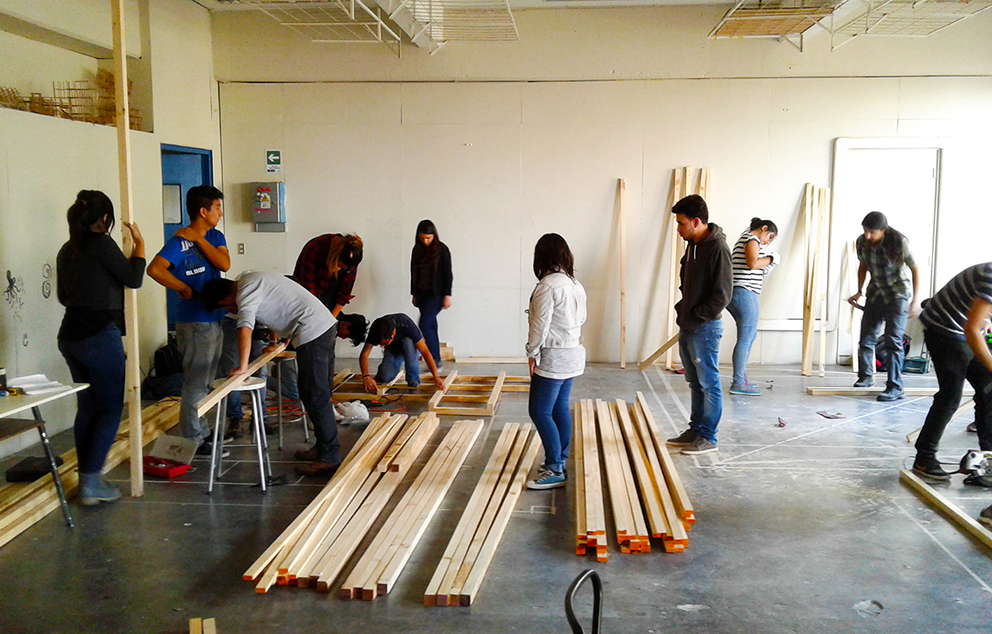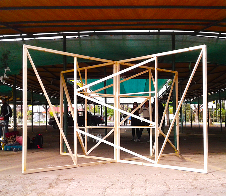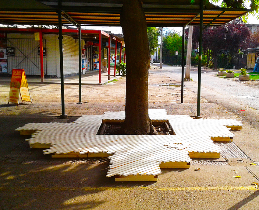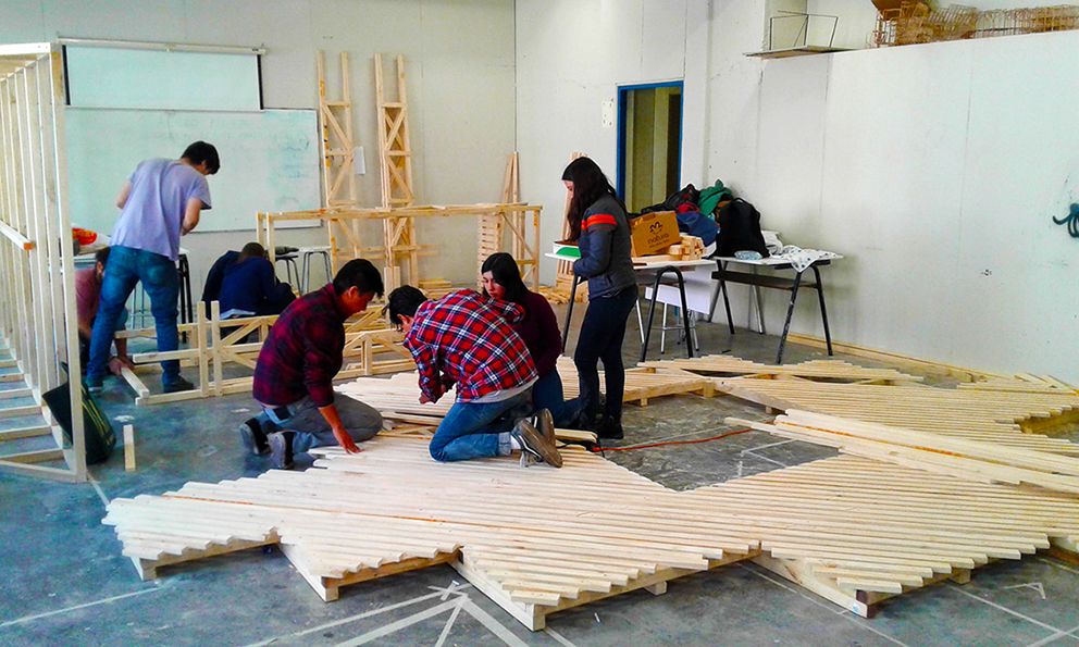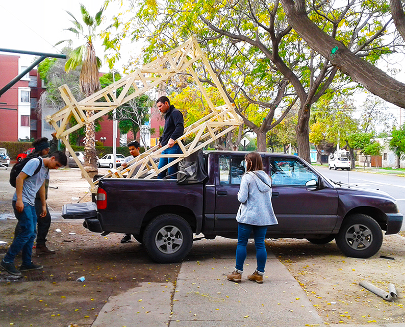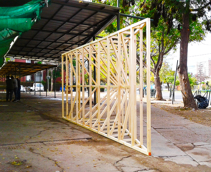 Pabellones temporales que se emplazan por un día en cuatro puntos perimetrales de un espacio público donde funciona temporalmente una feria, primero se visita el lugar, luego se diseñan con secciones lineales de madera estándar, se pre fabrican en la escuela, se trasladan y montan in situ, terminar re emplazándolos en cuatro lugares específicos de la escuela de arquitectura.